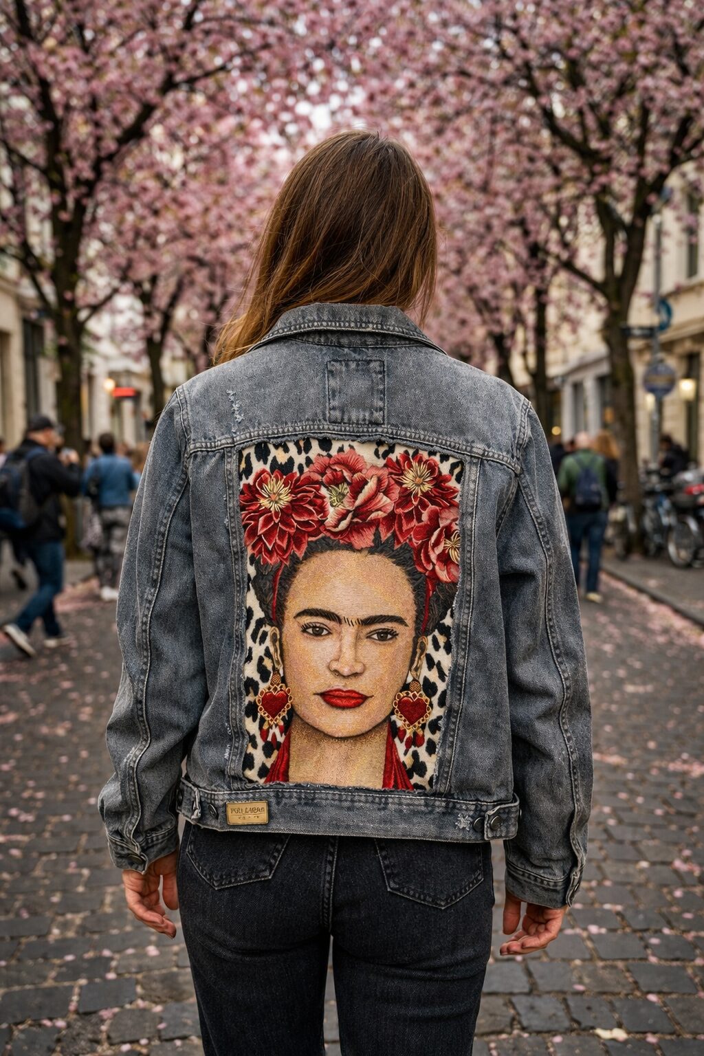 Das Gobelin Panel Mexican Face wird als vollflächige Applikation auf den Rücken einer Jeansjacke aufgenäht – und verwandelt sie dabei von einem Alltagsstück in ein tragbares Kunstwerk. So gehst du vor: