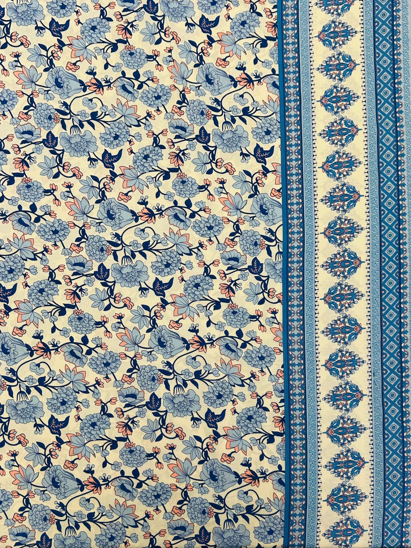 Dieser Viskose Stoff mit Blumen hat etwas Zeitloses. Nichts an ihm schreit – alles an ihm flüstert. Die zarten Blautöne auf cremefarbenem Grund erinnern an antikes Porzellan, an alte Postkarten, an den Geruch von frisch gebrühtem Tee am Morgen. Und dann diese Lachsakzente – ein winziger Farbton, der das Ganze zum Leben erweckt, ohne die Ruhe zu stören.