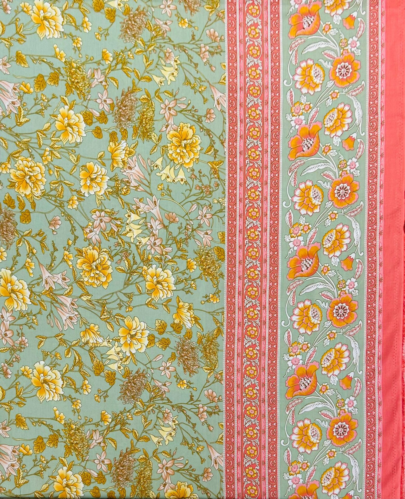 Dieser Viskosestoff mit Blumenmuster ist der Stoff, den du dir die ganze Saison gewünscht hast. Mintgrün trifft auf leuchtendes Sonnengelb – frisch, lebendig und trotzdem harmonisch. Filigrane Blumenranken verteilen sich locker über den Grund, begleitet von zarten Rosatönen und einer üppigen Korallenbordüre, die jedem Schnitt eine unverwechselbare Note gibt.